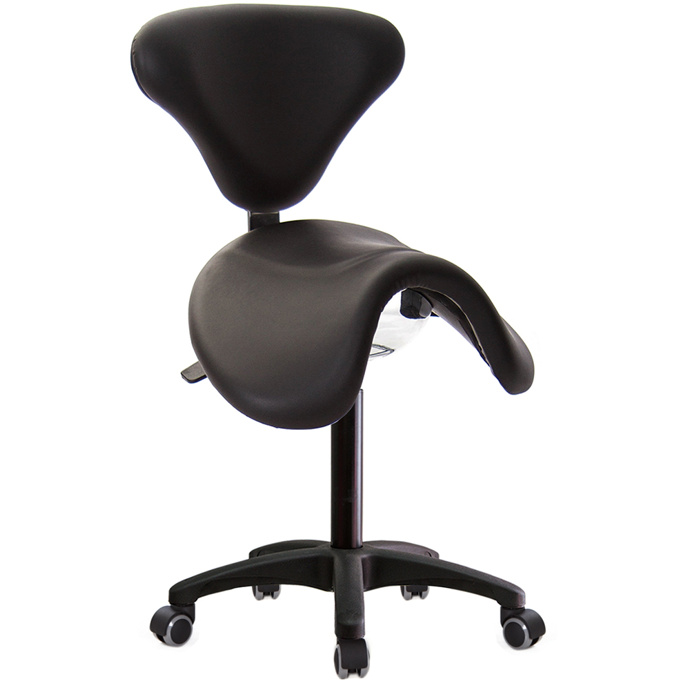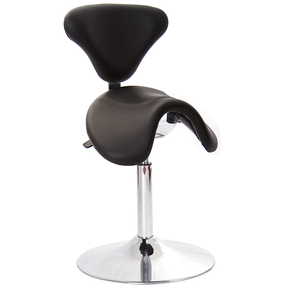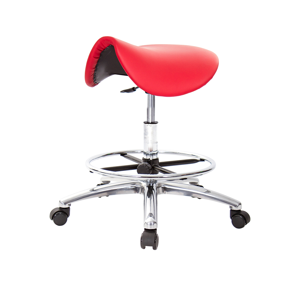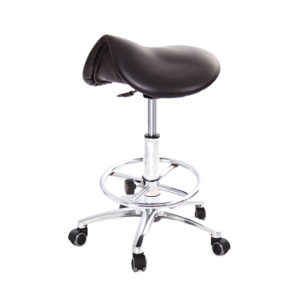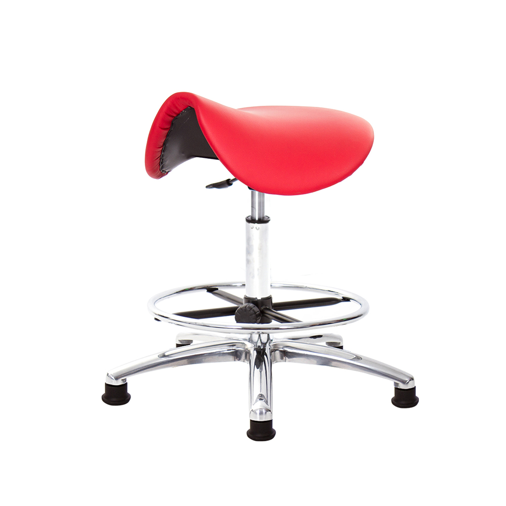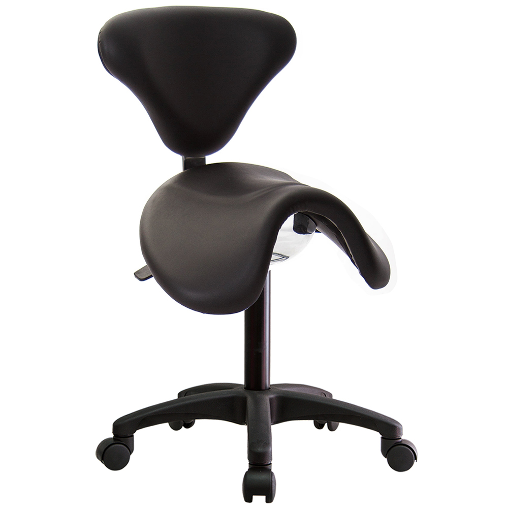 仿馬鞍造型坐墊,能大大降低久座時,臀部造成壓力,當全身重量集中在人體臀部、尾椎,一般的平面工作椅無法將壓力釋放,會累積在臀部,透過馬鞍椅工作,雙腿較集中於人體中心下盤,將累積的重量,透過雙腿平均釋放,有效減輕脊椎與臀部壓力。